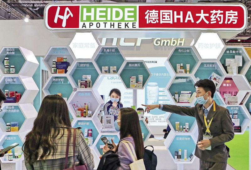 Visitors discover the exhibition booth of Heide Apotheke (HA), a German drugstore chain, on the opening day of the third China International Import Expo (CIIE) in Shanghai on November 6, 2020.