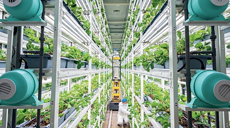 At the Jiuhe Digital-Intelligent Plant Factory in the Yueshenggufeng Modern Agricultural Industrial Park in Hohhot, Inner Mongolia, workers tend to strawberry plants.