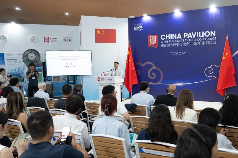 Li Gao, head of the Chinese delegation and vice minister of ecology and environment, speaks at a high-level side event during the COP30 in Belem, Brazil, Nov. 12, 2025. (Xinhua/Wang Tiancong)