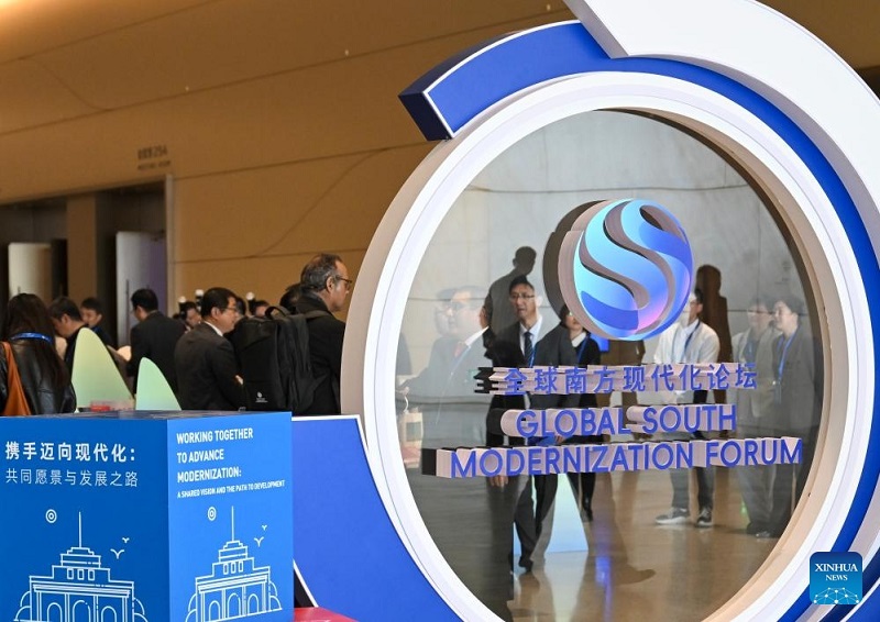 This photo taken on Nov. 21, 2025 shows a scene at the exhibition area for achievements at the Global South Modernization Forum in Beijing, capital of China. (Xinhua/Jin Liangkuai)