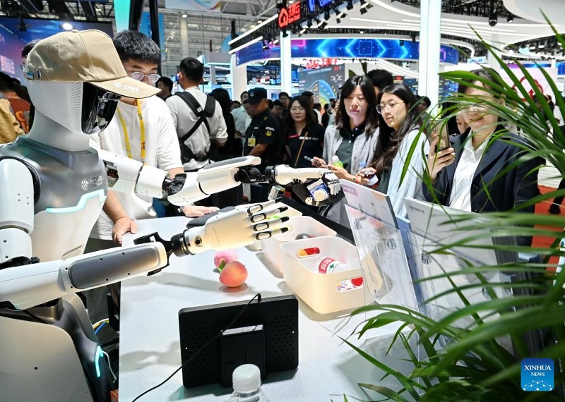 A humanoid robot is seen at the experience area of the 8th Digital China Summit in Fuzhou, southeast China's Fujian Province, April 28, 2025. (Xinhua/Lin Shanchuan)