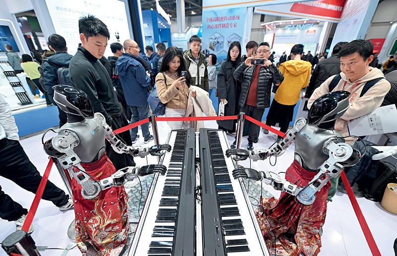 The 3rd China Embodied Intelligent Robotics Industry Conference and Exhibition, held in Hangzhou, Zhejiang Province, features a concentrated display of various types of humanoid robots and related components. The photo shows a humanoid robot playing the piano, attracting droves of visitors on March 11, 2026.