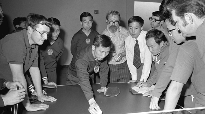 It was a chance encounter between two individuals that provided an opportunity for the two nations to begin to come together. In 1971, the world championship games in ping pong were held in Nagoya, Japan. Both American and Chinese ping-pong teams were participating. It is unclear why a young American player, Glenn Cowan, the youngest member of his team, got on the Chinese bus, whether by mistake or if he didn’t get to his own bus before it left. Whatever the case may be, he hitched a ride on the bus with the Chinese players, who were probably as surprised as he was, in his being there. While some of them were no doubt hesitant to talk with him, Zhuang Zedong, a ping-pong master and the leader of the Chinese team, came up and shook Glenn’s hand. He had also felt it appropriate to give this unexpected visitor a present, and he fished out from his bag a piece of silk cloth depicting the Huangshan Mountain, which he presented to Glenn. This immediately created a certain rapport between the two players.