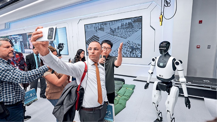 A foreign journalist takes a selfie with a humanoid robot in the exhibition hall at the Beijing Economic-Technological Development Area on September 29, 2025.