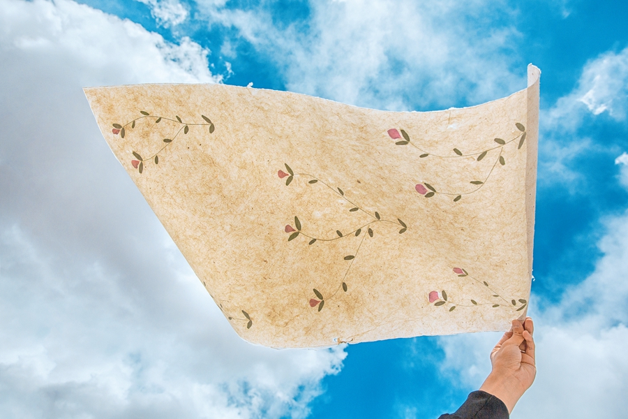 To survive in the modern world, the old paper making craft needs innovation. Years ago, to cater to the rising tourism market, Dorje started to introduce creative cultural products. One popular innovation is to place fresh flowers, leaves, and grass in between layers of paper during production. Tibetan paper, once mainly used for scriptures, now is widely used to make lanterns and notebooks, which are sold in many Tibetan scenic spots. Despite being introverted, Dorje has been active in working with media to promote Tibetan paper made in Shora.