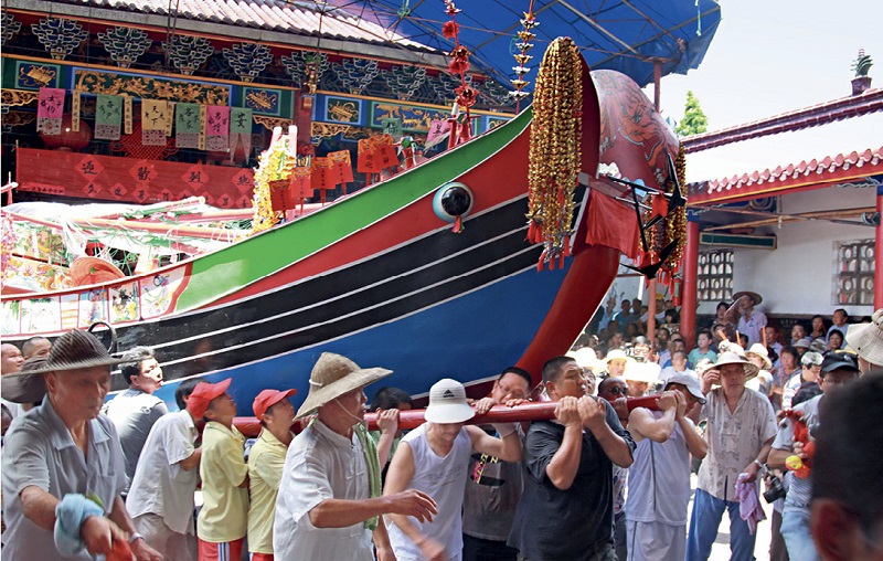 The parade processes along the street, carrying the figures of the five saints and local gods and goddesses, and perform a variety of local folk dance and music. At the same time, tens of thousands of people pray along the road for a peaceful summer. Following a ritual ceremony, the five saints figures are placed in the shrine chamber on the Major Heat boat, and the boat is towed by a fishing boat out into the open sea, where it is burned, manifesting that a wish of “sending the heat off, keeping a summer sound” is sent.
