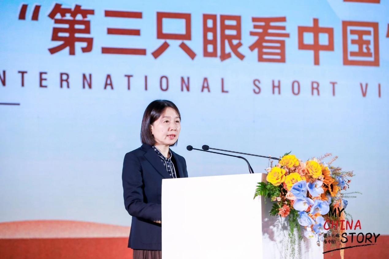 Ping Ping, deputy head of the Publicity Department of the Communist Party of China Henan Provincial Committee and director of the Information Office of the Henan Provincial People's Government, delivers a speech at the award ceremony of the 5th "My China Story" International Short Video Competition in Zhengzhou, Henan province, on Oct. 25, 2023. [Photo/CICG]