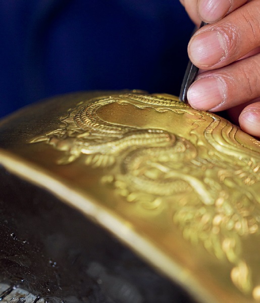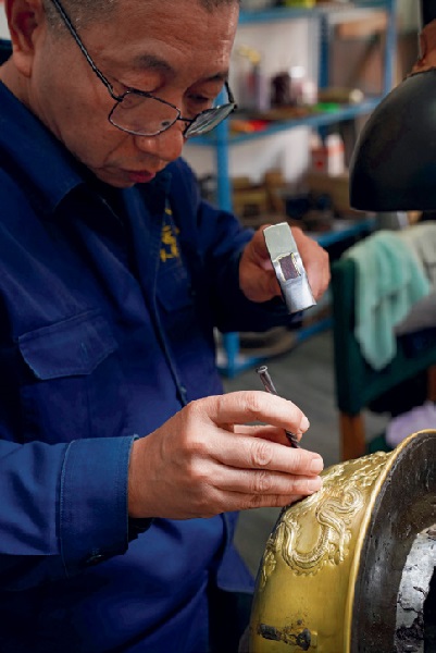 An artist is carving dragon patterns on the surface of a copper pot. Photo by Yu Xiangjun