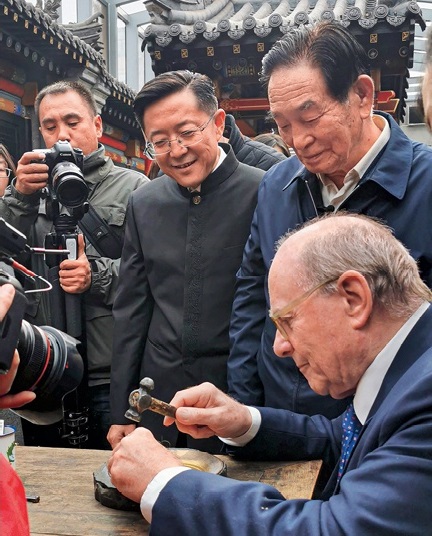 Under the guidance of Li, Alain Pompidou tries his hand at copper ware carving.