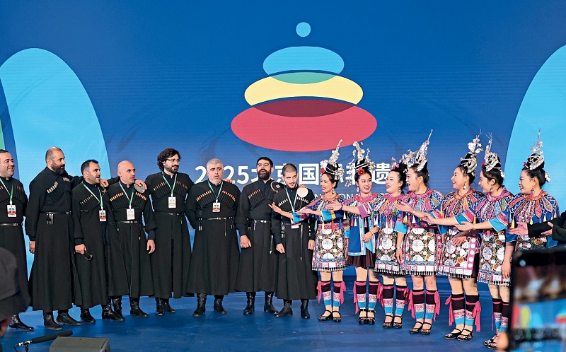 Inheritors of the Grand Song of the Dong ethnic group improvise songs with a group of Georgian artists at the opening ceremony of the 2025 Beijing International Week of Intangible Cultural Heritage in Beijing on October 17, 2025.