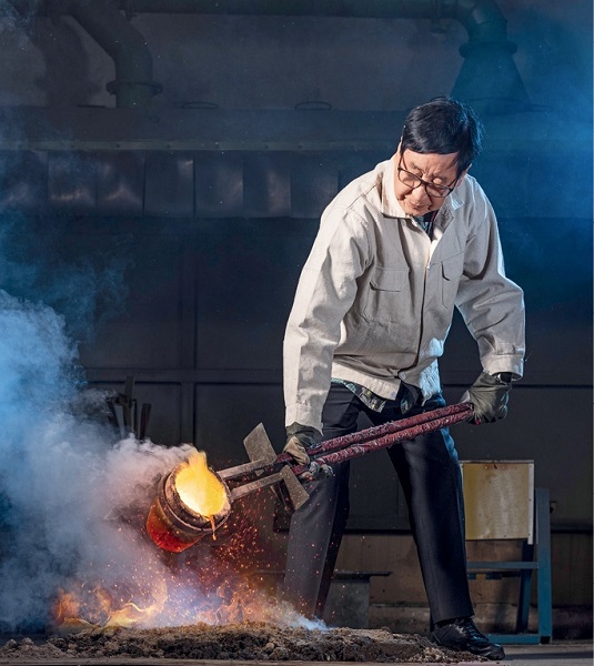 Zhu has contributed so profoundly to his country’s cultural heritage that he himself deserves to be cast in bronze – and not merely because bronze is his chosen medium. Born in 1944 in the historic city of Shaoxing, east China’s Zhejiang Province, Zhu carries his years lightly; his energetic presence and lively, intelligent eyes suggest a man decades younger. It is this very vitality that allows him to make copper “flow,” both as a material and as a cultural force, and that has established him as the representative master of China’s nationally protected copper sculpture technique, an intangible cultural heritage since 2008.