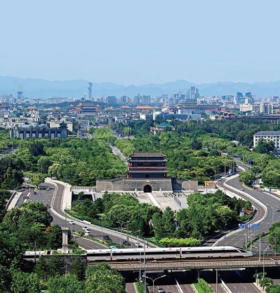 A Fuxing high-speed train passes Yongdingmen Gate, the landmark architecture at the southern end of Beijing's Central Axis.