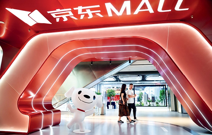 Visitors walk through the JD MALL in Beijing which has become an offline experience store that integrates shopping, entertainment, and leisure.