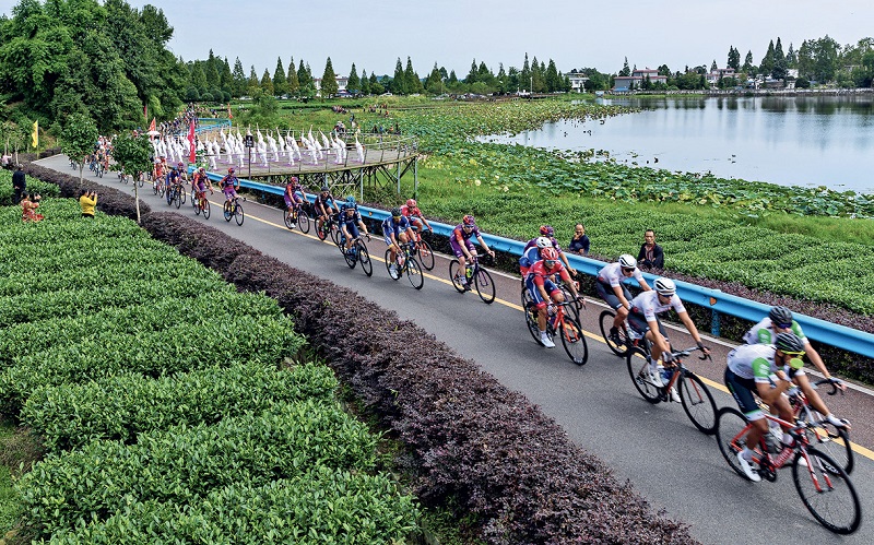 A bicycle race passing through the tea garden in Mengding Mountain, Ya’an City, Sichuan Province.