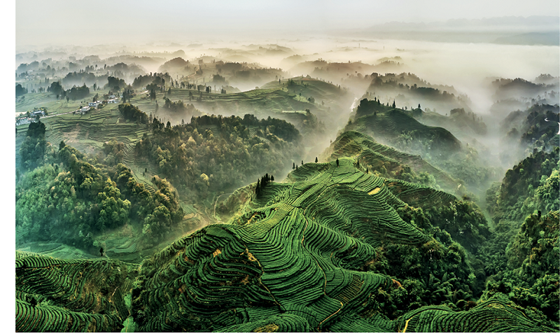 An aerial view of a mountainous area in Ya’an. The local balmy weather is perfect for tea cultivation.