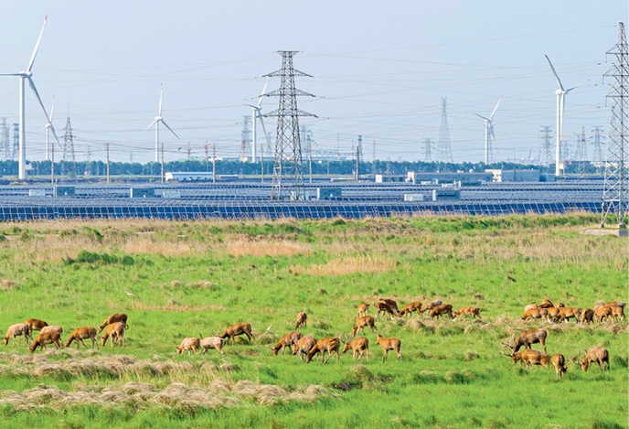 Wind turbines and photovoltaic panels operate synergistically, supplying a constant flow of green energy from Fengbuyu Industrial Demonstration Base in Yancheng, Jiangsu Province on May 28, 2025.