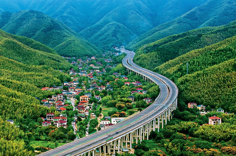 The S14 Hangzhou-Changxing-Yixing Expressway winds through the lush mountains and lucid waters of Meishan Township in Changxing County of Huzhou City, Zhejiang Province, on September 23, 2025.