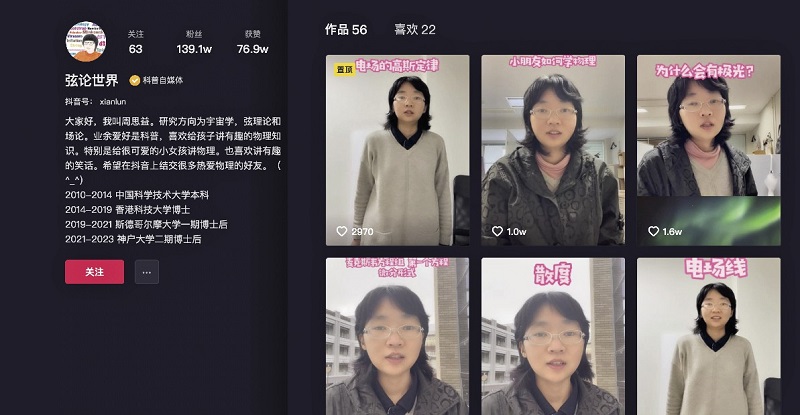 “These are the keywords of my research area,” said Zhou, describing her recent foray into Douyin. For about four months, she has been posting videos on the app to explain science to laypeople. She breaks down long and mysterious scientific terms into straightforward everyday language so that everyone can get a little glimpse into the deepest enigmas of the universe. Her account, Xianlun Shijie (World of String Theory), has already acquired 245,000 followers from various professions and her work is gaining recognition, with hundreds of thousands liking her posts.
