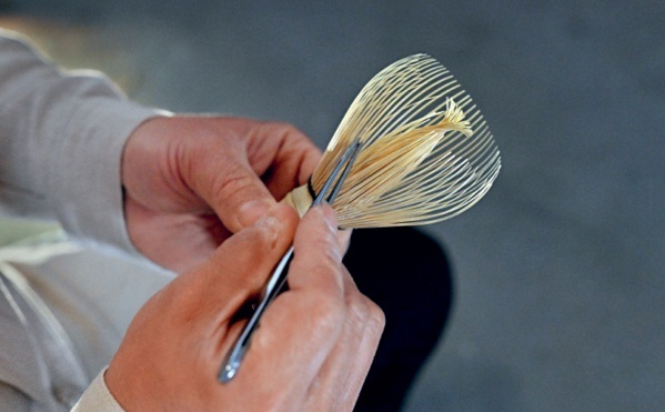 Chen Jinxin makes a tea whisk, the main tool used in matcha preparation for the “Jingshan Tea Banquet,” a national-level intangible cultural heritage.