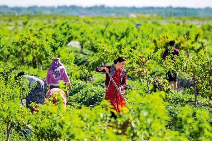 Villagers are cultivating the fields of a fruit base in Yiyelegan Village, Kizilsu Kirghiz Autonomous Prefecture, Xinjiang Uygur Autonomous Region on June 19, 2020.