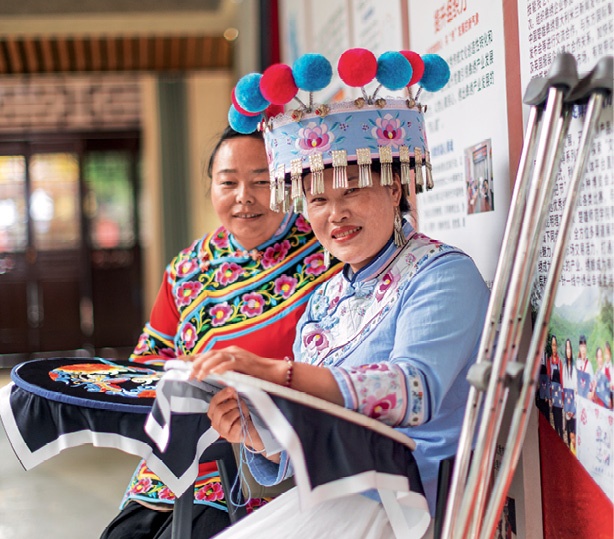 After 2012, as poverty alleviation and rural revitalization initiatives reached the mountainous areas, the Chuxiong prefectural government, drawing on ethnic cultural resources, vigorously promoted Yi cultural industries and decided to train 100,000 female embroiderers to boost rural revitalization. The Chuxiong Disabled Persons’ Federation integrated resources from multiple stakeholders to establish a Yi embroidery training base, the first in Yunnan that taps into local intangible cultural heritage to help people with disabilities. It also launched the Female Embroiderers Training Program, which has helped create jobs for 2,000 disabled female embroiderers.