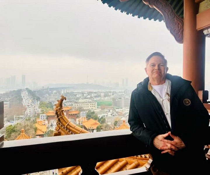 Chris Nash stands at the top of the Yellow Crane Tower overlooking the Wuhan City.