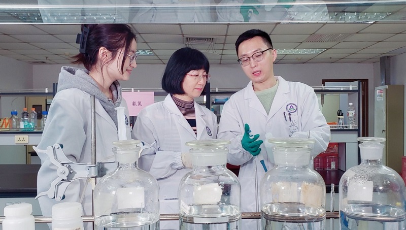 Liu Rui (center) conducts research with her team members in the laboratory.