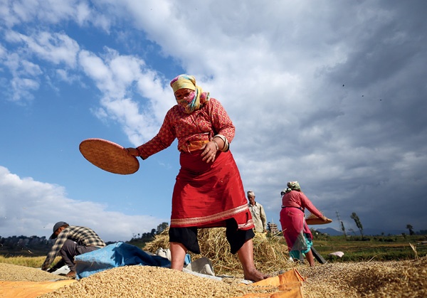 Nepali farmers winnow rice to separate the grain from the husks in a field in Patan, Nepal, on November 6, 2024.