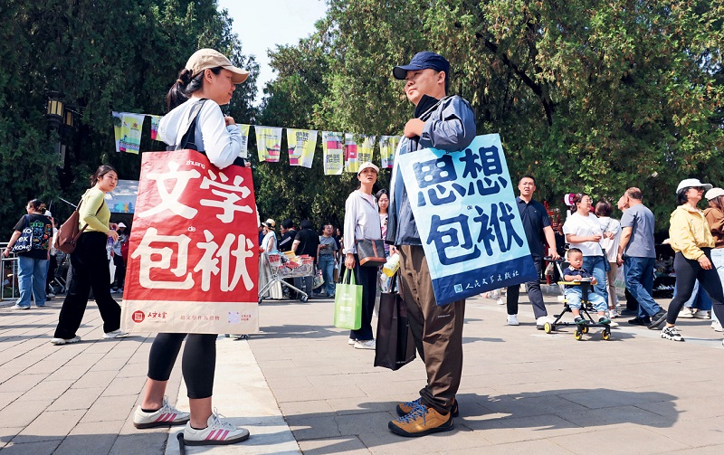 Tote bags with the words “Wenxue Baofu” (Literary Burden) and “Sixiang Baofu” (Mental Burden) sell very well at the Temple of Earth and Me book fair 2025 at the Temple of Earth Park in Beijing on September 21, 2025.